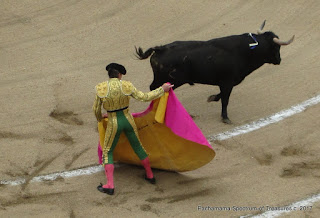 The theater is an old, round, steep sided, concrete bleachers, open air stadium seating about 10,000. Today's attendance was about 4,000 spectators. On the initial entry of the bull to the ring there is a brief dance with a colourfully costumed matador who struts around like a peacock. Apparently it is a common misconception that the red cape angers the bull – the bull is colour blind. Now a picador enters the arena on horseback armed with a lance (vara) to deliver a fierce blow to the bull. The horse is wearing protective armour (peto). On one occasion the bull was able to overturn the armored horse and picador. Then 3 banderilleros enter the ring, each with the objective of planting a pair of sharp barbed sticks in the bull's shoulders to anger, agitate and further weaken the bull. The bull now bleeding, confused and exhausted from the lance and 6 banderillo injuries will face the matador. Some competition - the macho matador now enters the ring to perform the final barbaric event - estocada (killing thrust of the sword).
